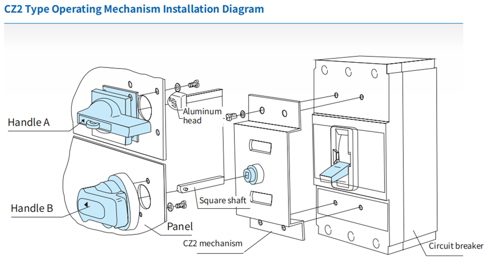 CZ2 operating mechanism features a unique rotating design for smooth breaker opening, closing, and resetting. Easy to install and adjust, with performance exceeding similar products. Compatible with A, B, and C rotary handles — users can choose as needed. Type-tested and certified by the National Electric Testing Center.