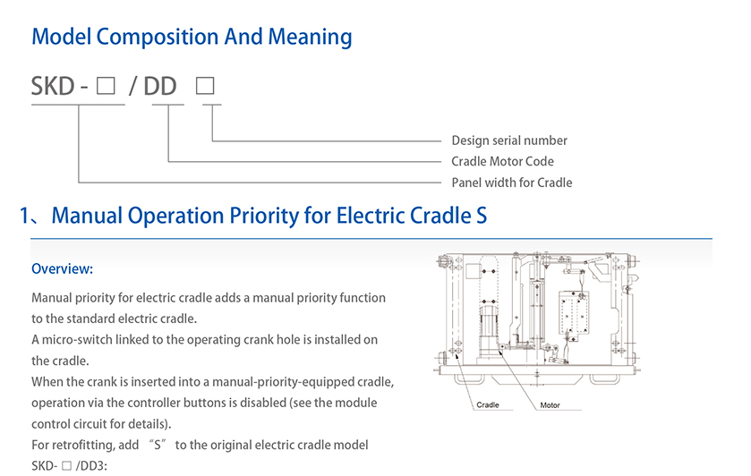 The electric cradle is equipped with electric operation based on the original manual cradle, providing the necessary hardware foundation for the intelligentization, programming and remote control of switchgears.