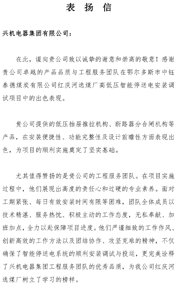 Xing Electric Appliance Group recently received a letter of commendation from Hongqinghe Coal Preparation Plant, part of Zhongyu Taide Coal Co., Ltd. in Ordos, praising our outstanding performance in the high- and low-voltage intelligent power on/off system installation and commissioning project. This acknowledgment reflects our growing reputation in smart mining and intelligent power distribution.