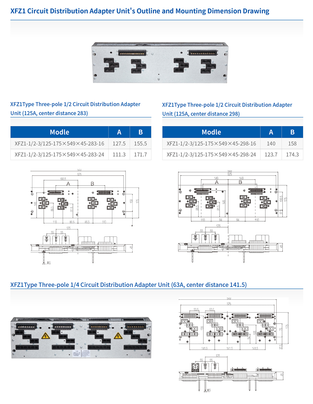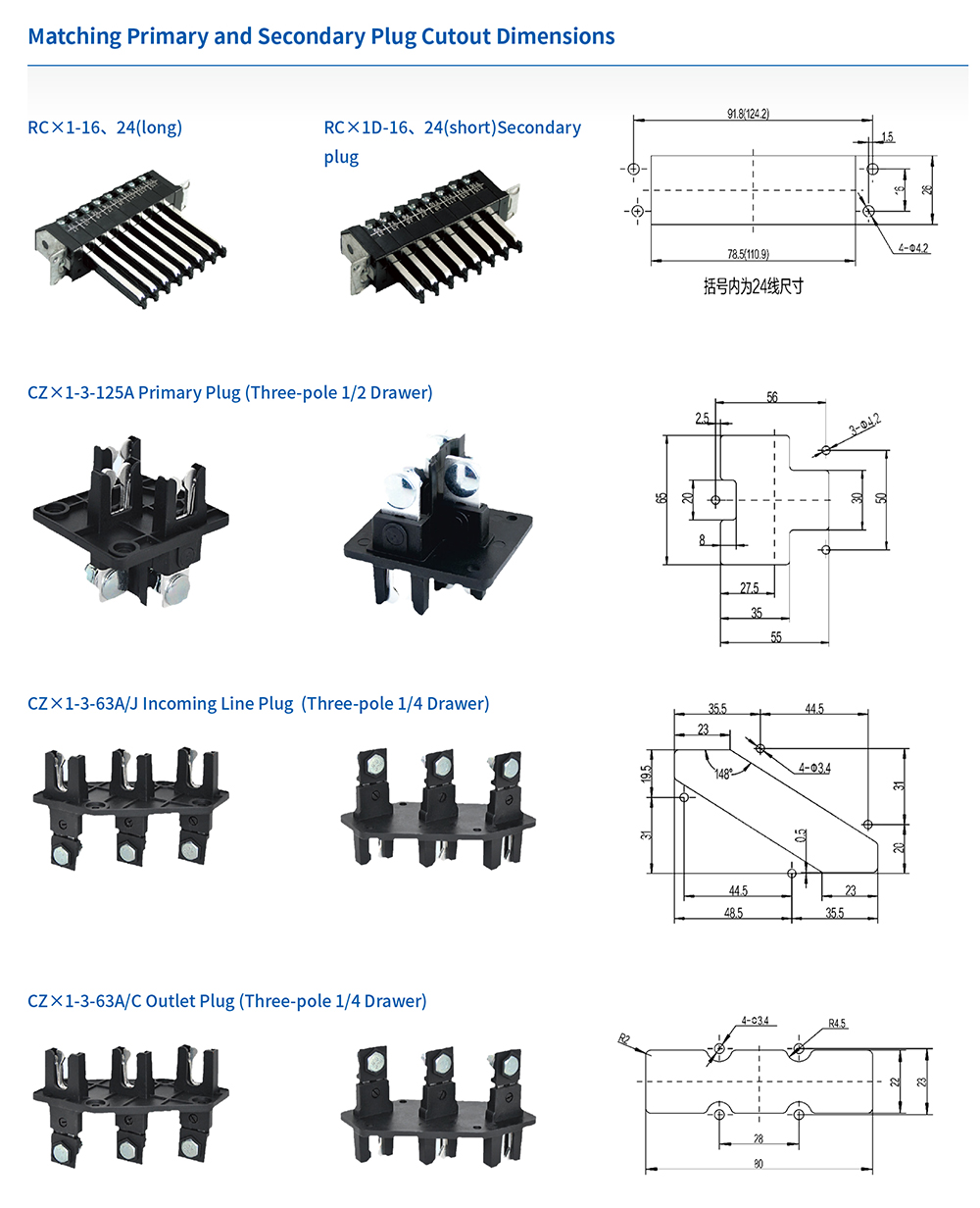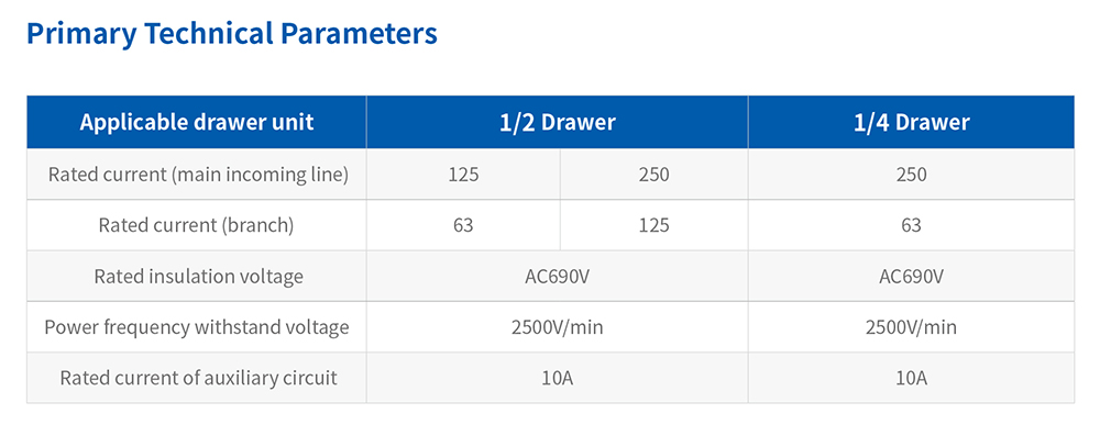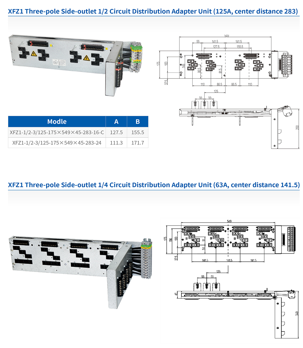 XFZ1 series circuit distribution adapter units are used for power distribution and connection of 1/2 and 1/4 drawer functional units in low-voltage withdrawable switchgear and controlgear assemblies. By operating in conjunction with the 1/2 and 1/4 drawers, they enable the operation, control, protection, and power connection of the functional units. The 1/2 drawer is available with two center distances: 283mm and 298mm. The center distance for the 1/4 drawer is 141.5mm.